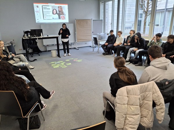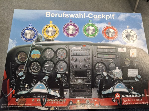 Dort angekommen wurden wir zunächst von Frau Bertz in Empfang genommen. Sie informierte uns über die Angebote der Berufsagentur. Anschließend „stiegen“ wir ins „Berufswahl-Cockpit“, um herauszufinden, welche Berufsbranche für uns in Frage kommen könnte. Ebenso erklärte sie uns, was die nächsten Jahre noch auf uns zukommt, bis wir schließlich mit der Ausbildung beginnen können.